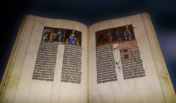 Zunächst möchte ich mich dem Material widmen. Im Mittelalter wurde meistens auf Pergament geschrieben. Hierbei handelt es sich um nichts anderes als bearbeitete Kuhhaut. Die Haut wurde abgezogen, zugeschnitten und von Haaren befreit. Das Pergament wurde nun mehrfach gefaltet, je nachdem wie viele Seiten das Buch haben sollte. Anschließend wurde es mit Tinte beschrieben. Korrekturen waren mithilfe eines Schabers möglich. Die Tinte konnte bei Bedarf einfach abgeschabt werden. danach wurde das Buch mit einem Buchrücken versehen und zwischen zwei Buchdeckel eingebunden. Diese Buchdeckel waren entweder aus Leder oder aus Holz. Sie wurden mit Eisen beschlagen, um durch das liegen auf dem Pult nicht ab zu nutzen. Zusätzlich konnten Verzierungen angebracht werden, was aber nur bei sehr wertvollen Werken Anwendung fand.